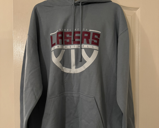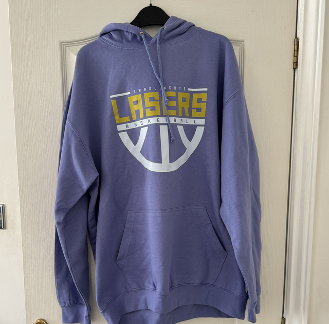 Hoodie, with same colour hood lining. Large Lasers sign on the front with a half-moon basketball